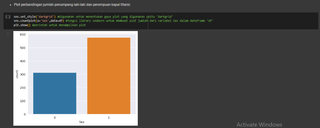 1. barplot: plot of the number of passengers based on gender, Pclass, Embarked, and Passenger safety.