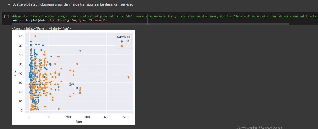 3. Scatterplot: plot of the relationship between passenger age and fare.
